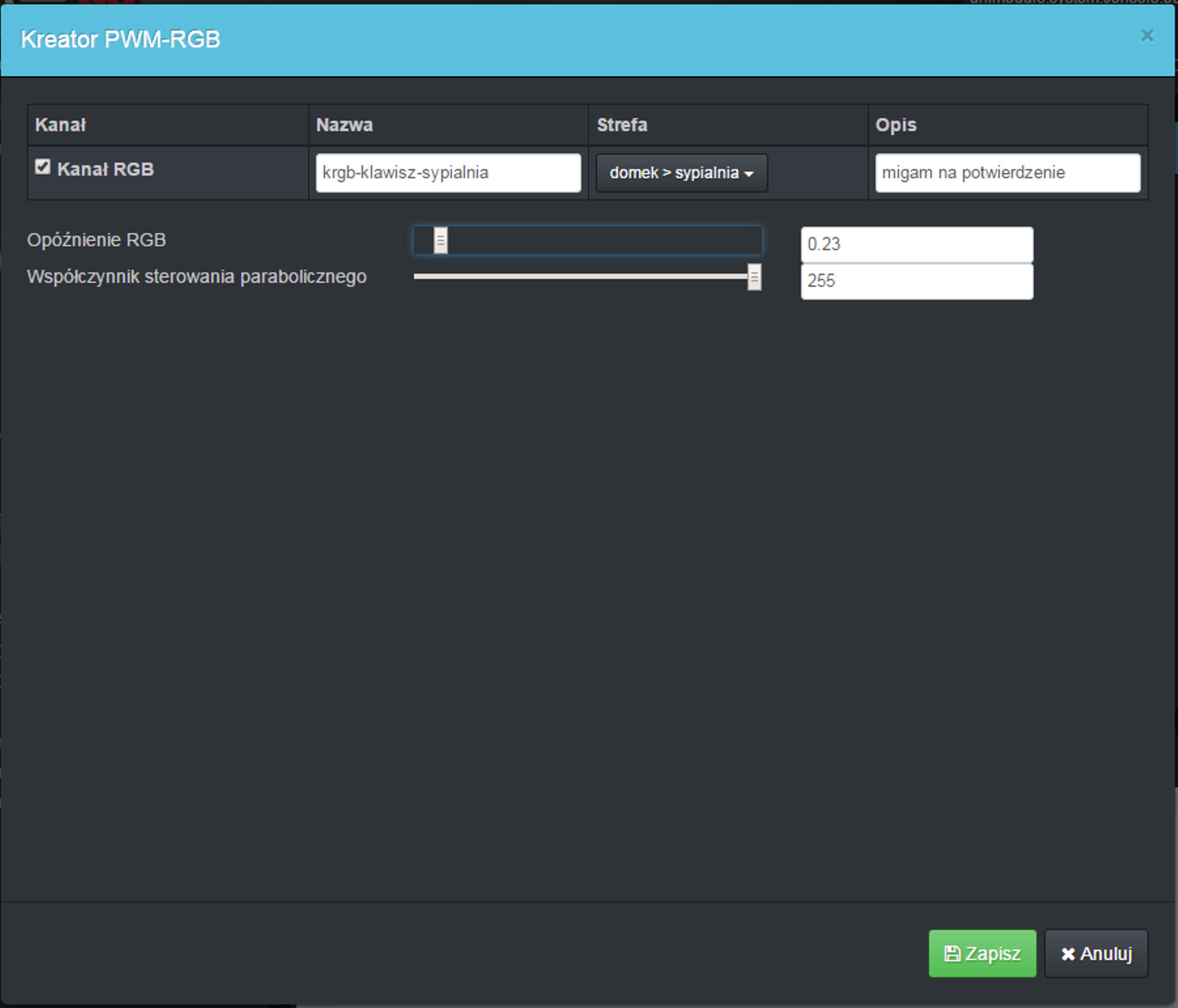 - Opóźnienie RGB - opóźnienie automatyczne przy przejściach pomiędzy wartościami (w sekundach)