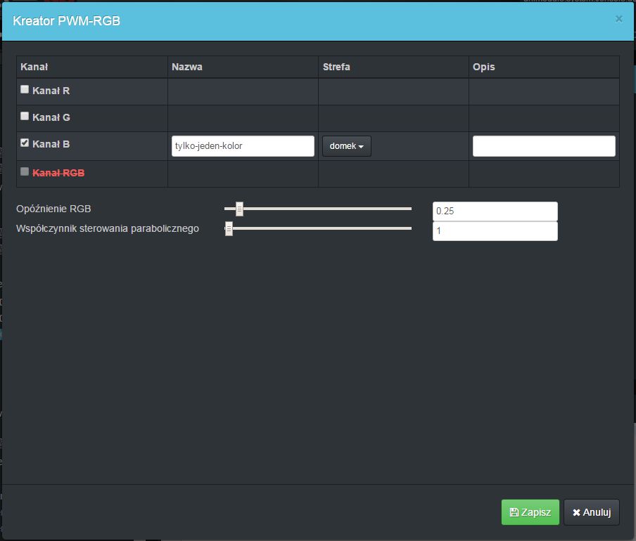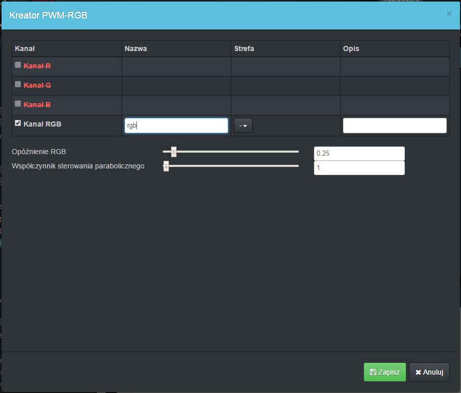 - Kanał RGB - włącza możliwość sterowania kanałem RGB LED