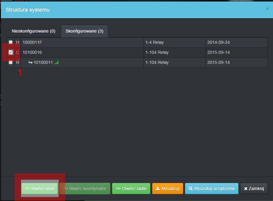 wybieramy urządzenie z listy [1] i włączamy [Stwórz Host] [2]