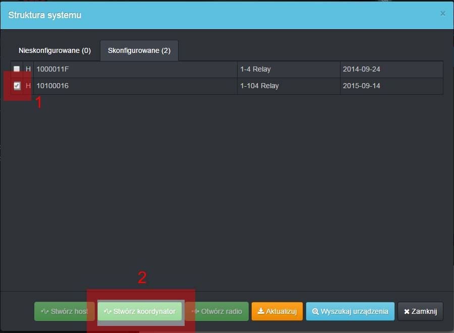 zaznaczamy na liście urządzenie które chcemy zmodyfikować, wybieramy [Stwórz Koordynator]
