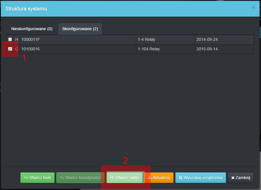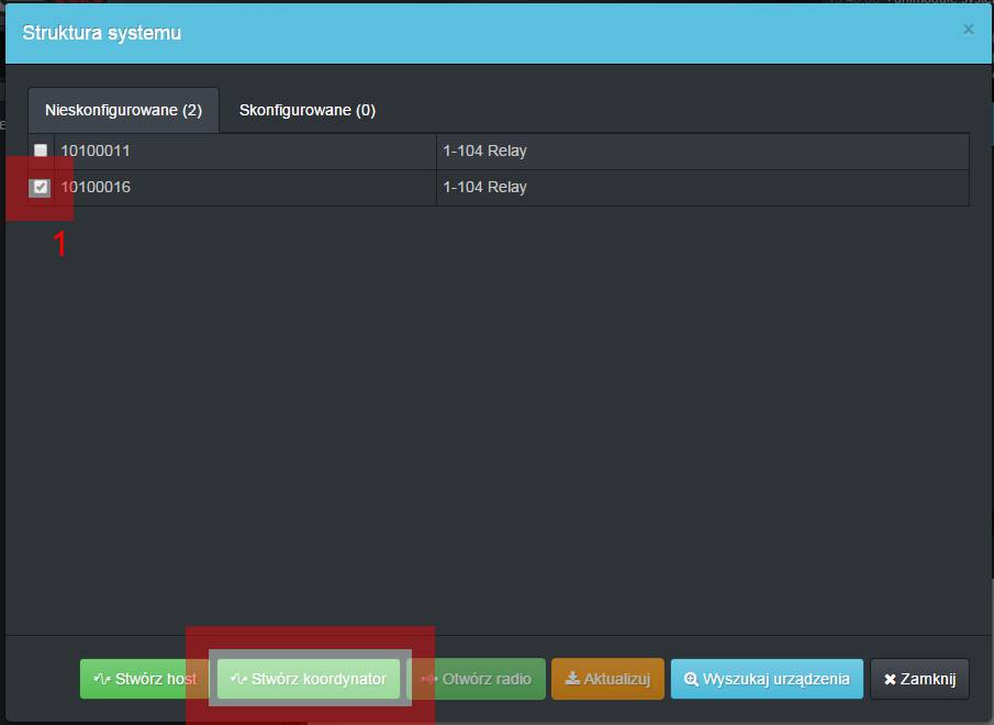 Aby dodać urządzenia radiowe należy wskazać urządzenia [1] z których utworzymy Koordynatory i włączyć na nich przycisk [Stwórz Koordynator] [2]