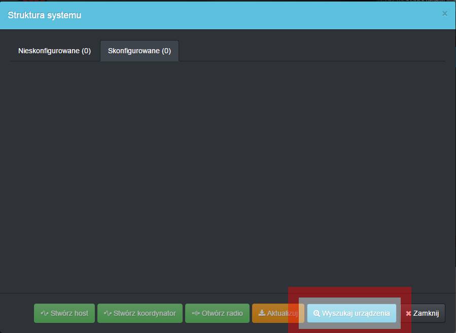 Klawisz [Wyszukaj urządzenia] rozpocznie wyszukiwanie urządzeń podpiętych kablowo Jeśli urządzenia zostały podpięte do magistrali Wee i zasilone to po pewnym czasie powinniśmy zobaczyć
